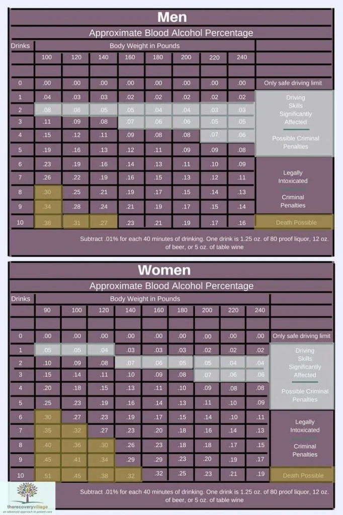 - Blood alcohol concentration charts show what a healthy range of alcohol intake is for your weight and gender.
