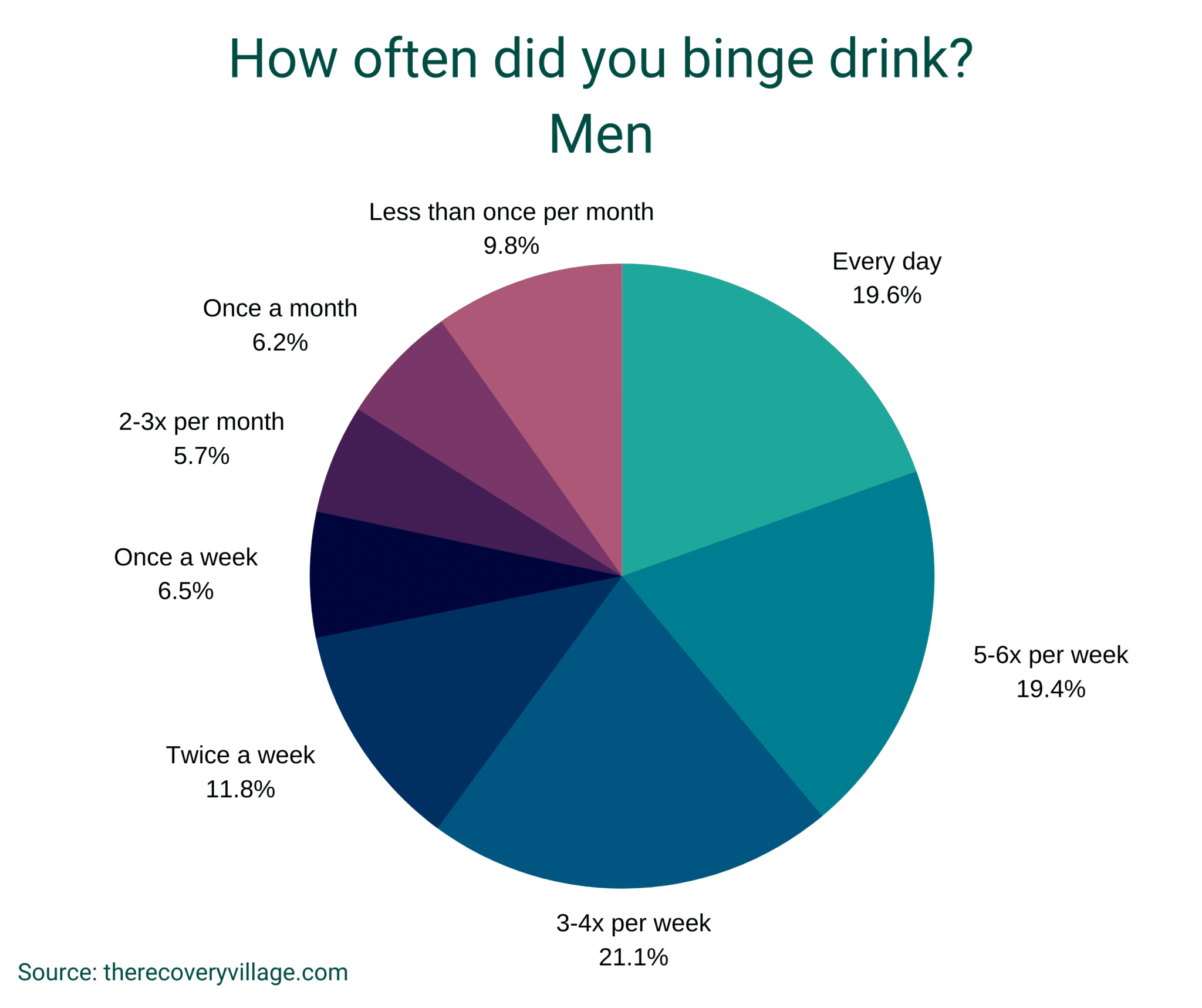 Meanwhile, women were 31% more likely to report binge drinking just once a week, 72% more likely to binge just two to three times per month and 129% more likely to report binge drinking less than once per month.