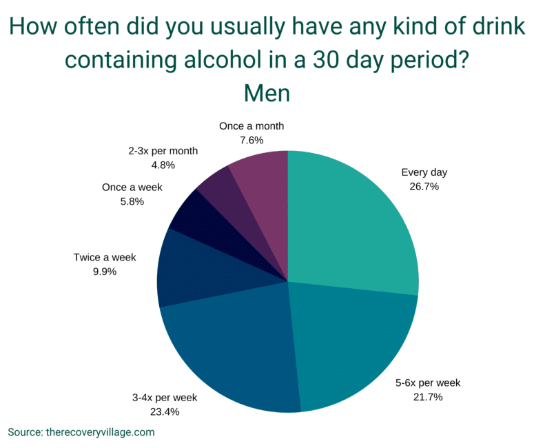 Participants were first asked how frequently they drank in a typical 30 day period and how many drinks they consumed on a typical day. Men reported drinking more and more often. They were: