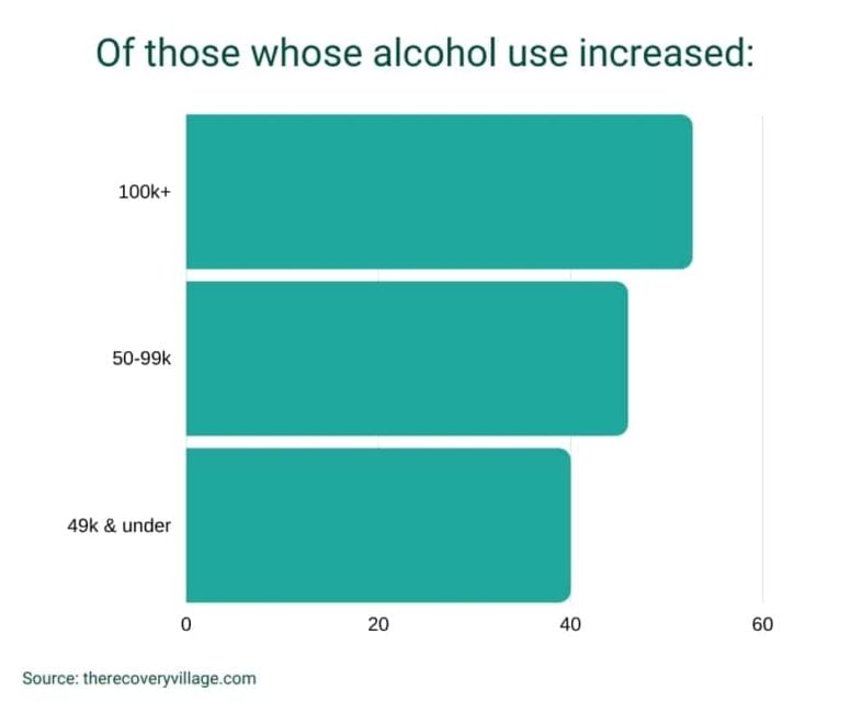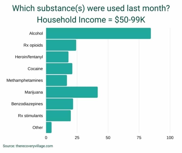 Rate of alcohol use: Many respondents reported higher rates of past-month drug and alcohol use. The rate of past-month alcohol use grew with household income: