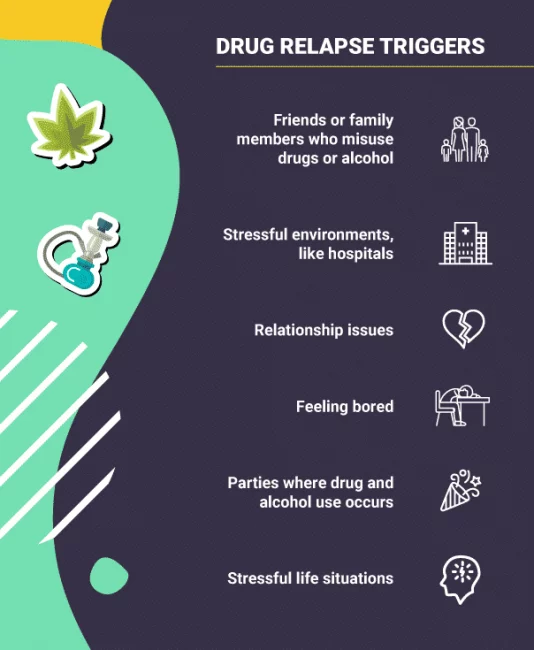 - Common relapse triggers are relationship issues, stressful environments, and boredom.