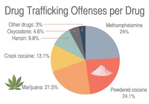 There are six main drugs most commonly trafficked in the United States. In 2013, the percentages of drug trafficking offenses per drug were as follows: