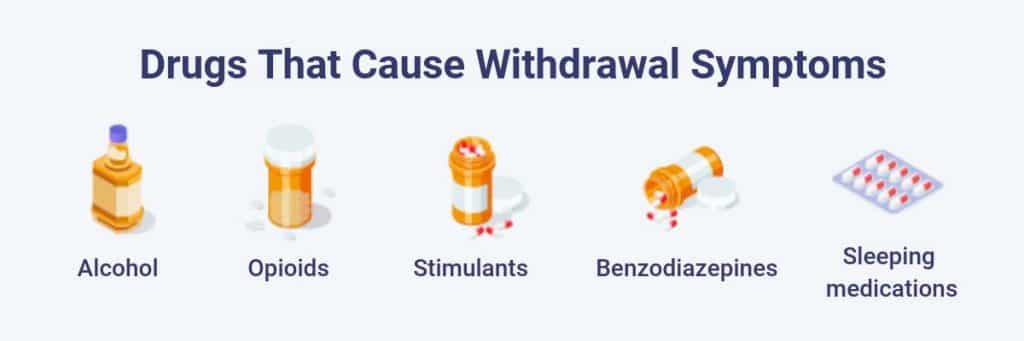 There are many substances that can alter the brain and the way a person feels. These substances can become addictive. When used in excess and a person relies on them to feel normal, stopping their use can cause withdrawal symptoms. Drugs that cause withdrawal include: