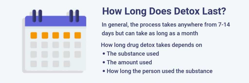 If a person is using more than one substance or has a co-occurring mental health issue, the detox process could take longer. In general, the process takes anywhere from seven to 14 days but can take as long as a month.