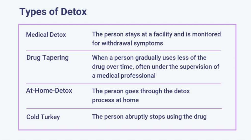 At-Home Detox: when a person undergoes detoxification in their home. This method has the advantage of the person being in the comfort of their own home, but it can be dangerous if done unsupervised. If home drug detox is done, it is best to have a medical professional present to help the person through it and keep them safe.