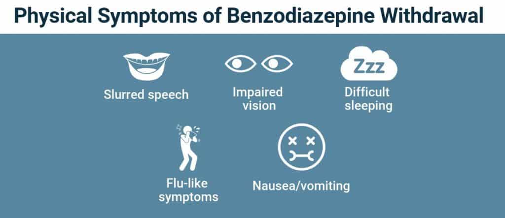 Physical symptoms of benzodiazepine withdrawal are slurred speech, impaired vision, vomiting, and flu-like symptoms.