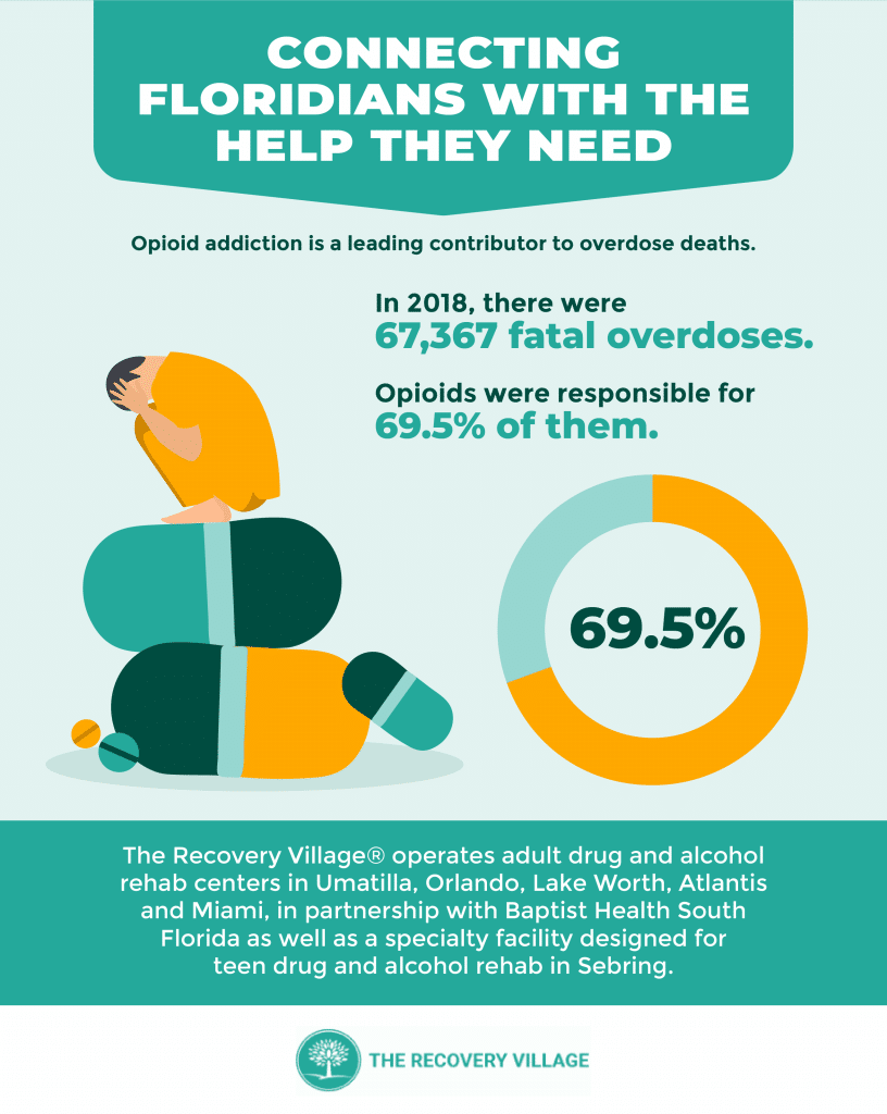 To help support Floridians facing addiction or mental health concerns, The Recovery Village operates adult drug and alcohol rehab centers in Umatilla, Orlando, Lake Worth, Atlantis and Miami, in partnership with Baptist Health South Florida as well as a specialty facility designed for teen drug and alcohol rehab in Sebring.