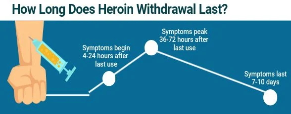 For heroin, the withdrawal symptoms start within the first 24 hours (sometimes as soon as four hours) from the last use, peak within 36 to 72 hours, and last seven to 10 days for most people. People who use heroin chronically may experience some withdrawal for up to three or four weeks.