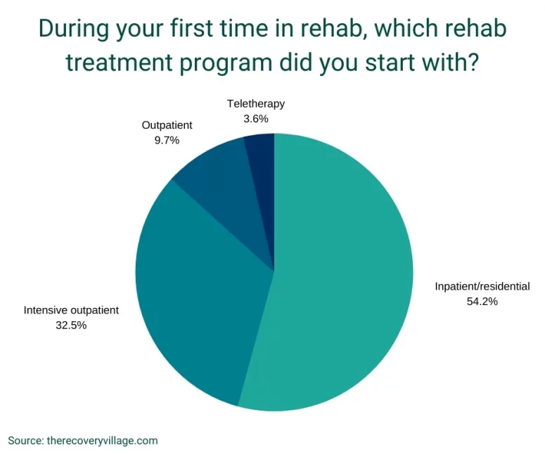 Among the participants who’d attended substance abuse treatment, most spent their first time in inpatient or residential care (54%). Starting at a higher level of care (like inpatient care) and slowly moving down to less intensive levels of care as you improve has been shown to have better outcomes for recovery. In fact, people who started rehab with inpatient treatment were 31% more likely to finish their programs than those who didn’t.
