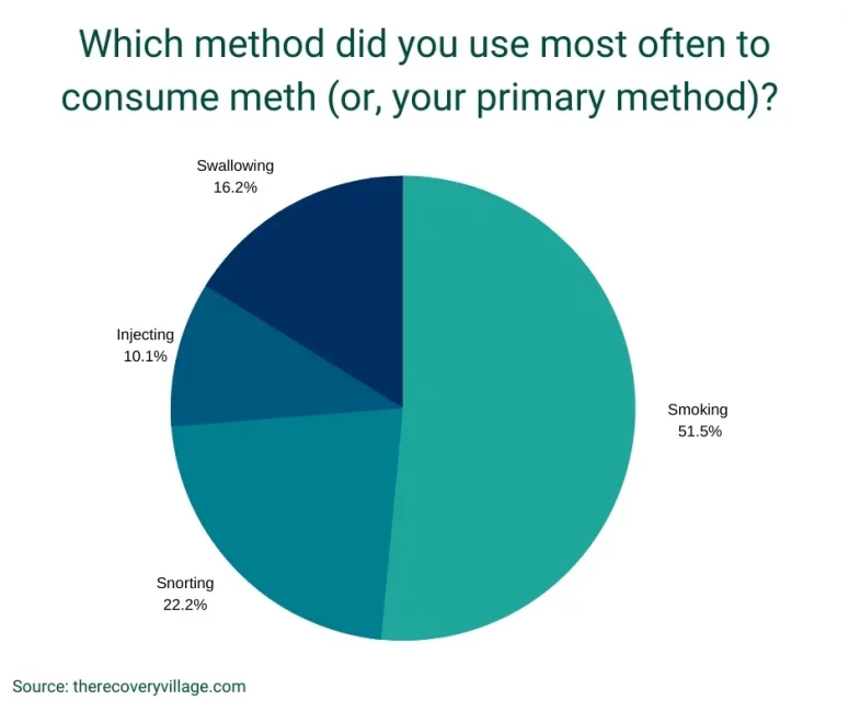 Smoking meth is the most common method (63%), followed by snorting (44%), injecting (27%) and swallowing (30%). While more than half of people stick to one method of using meth (59%), 41% use multiple methods and 7% use all four methods over their lifetime.