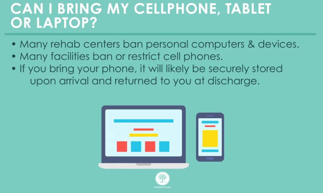 - Cell phones: Many rehab centers ban or restrict personal computers and cell phones. Some centers let you bring them, but only use them during specific times.