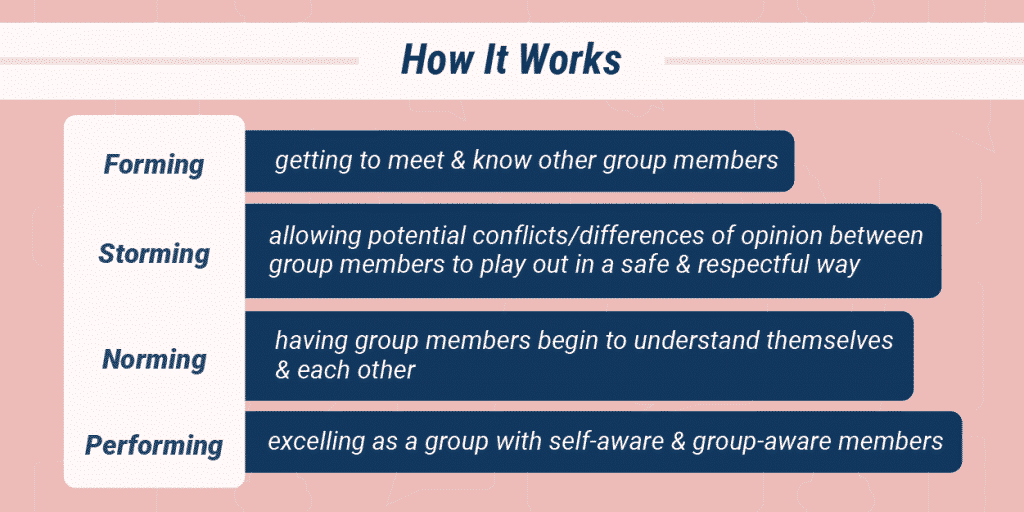 - Storming: allowing potential conflicts and differences of opinion between group members to play out in a safe and respectful way.