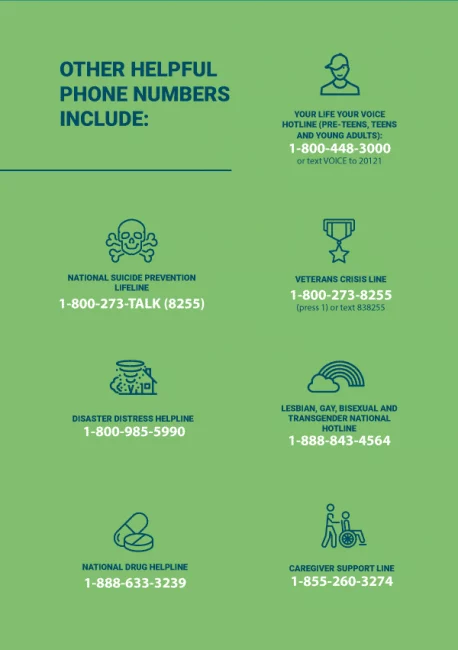 - National Suicide Prevention Lifeline: 1-800-273-TALK (1-800-273-8255)