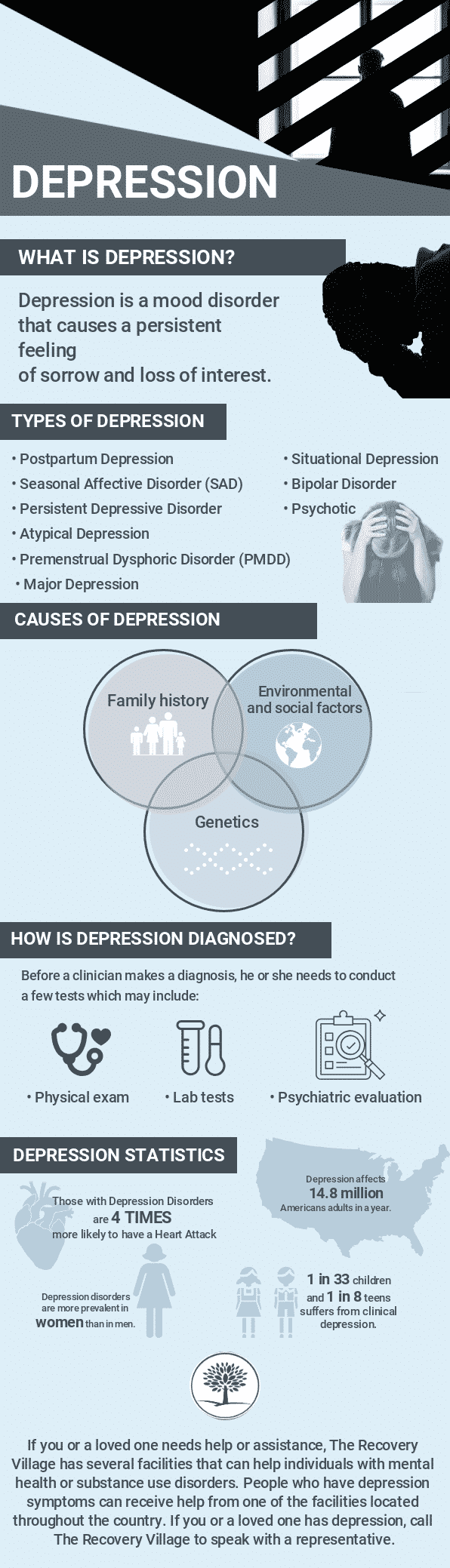 Depression often begins in the teens or early adulthood, but it can happen at any age. More women receive a diagnosis of depression than do men. This statistic may be due to the idea that women are more likely than men to seek treatment. Other factors include a personal or family history of other mental health disorders, such as anxiety disorder, suicide attempts, post-traumatic stress disorder or eating disorders.